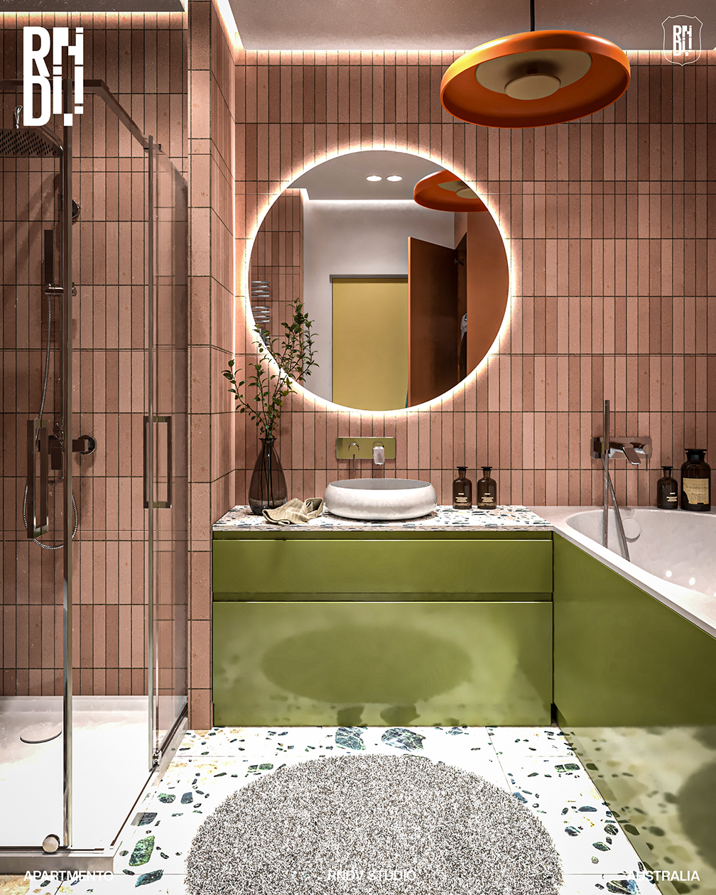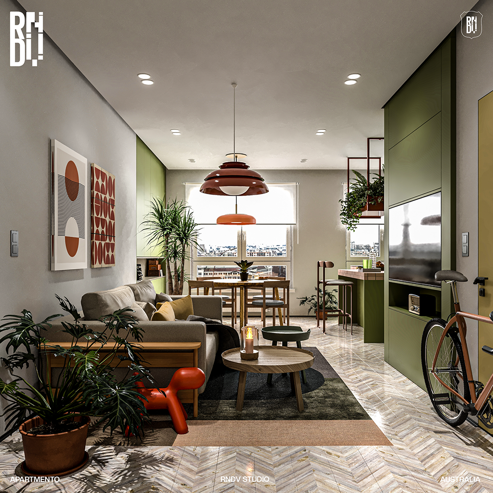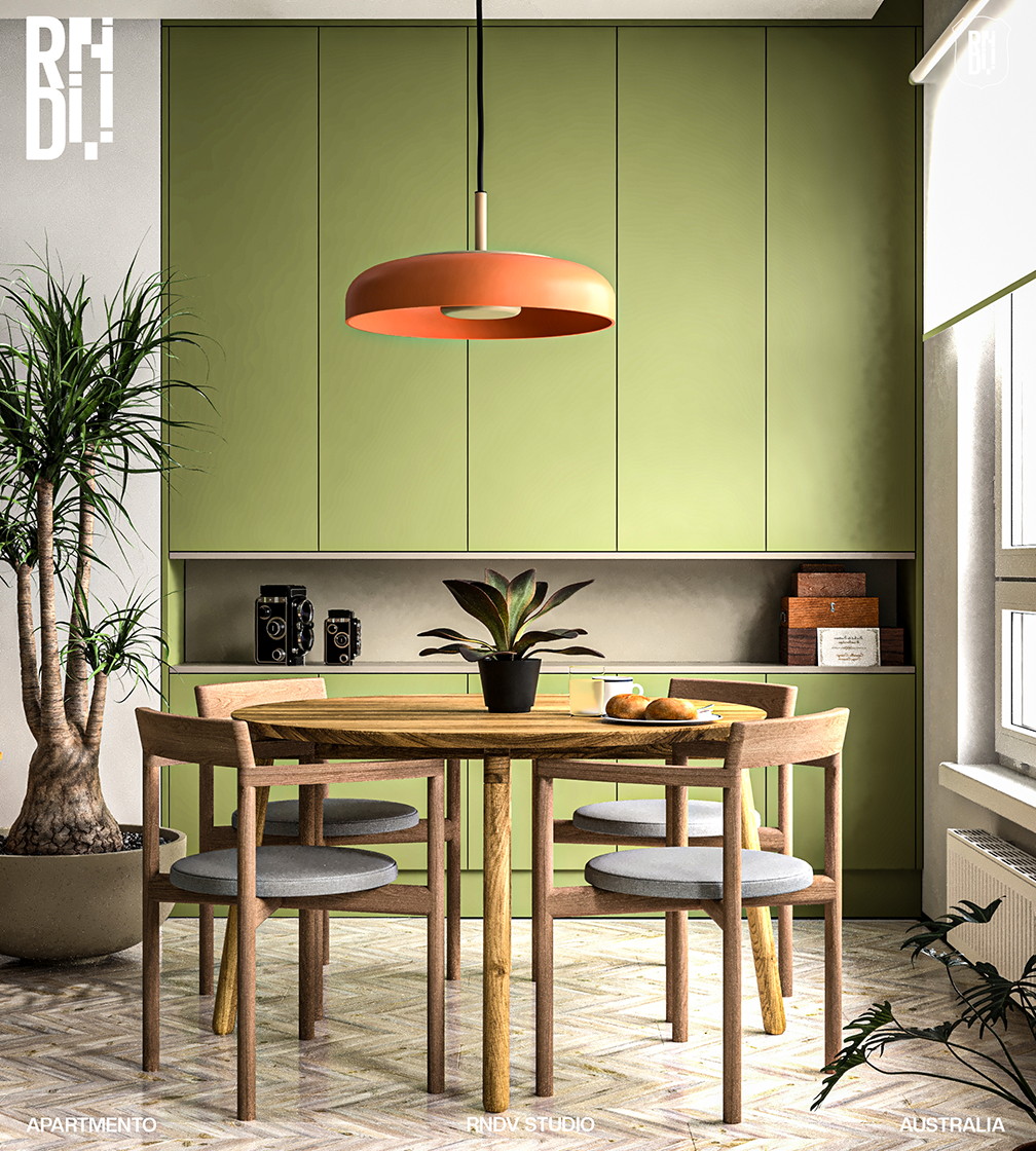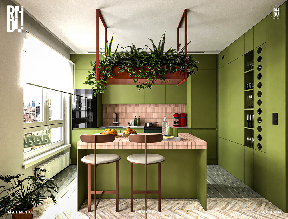 This two-bedroom 1960s apartment is using colours and materials that pay homage to the original mid-century interior. The 150-square-metre apartment is split into two zones with a living space and kitchen at the front and two bedrooms. Visible from the living room, an island kitchen countertop made from the classic pink tiles, with pistachio green carpentry. Across from the dining nook is a living room with a beige colour sofa bed. To the other side of the kitchen is a corridor that leads to a bathroom and the master bedroom.
