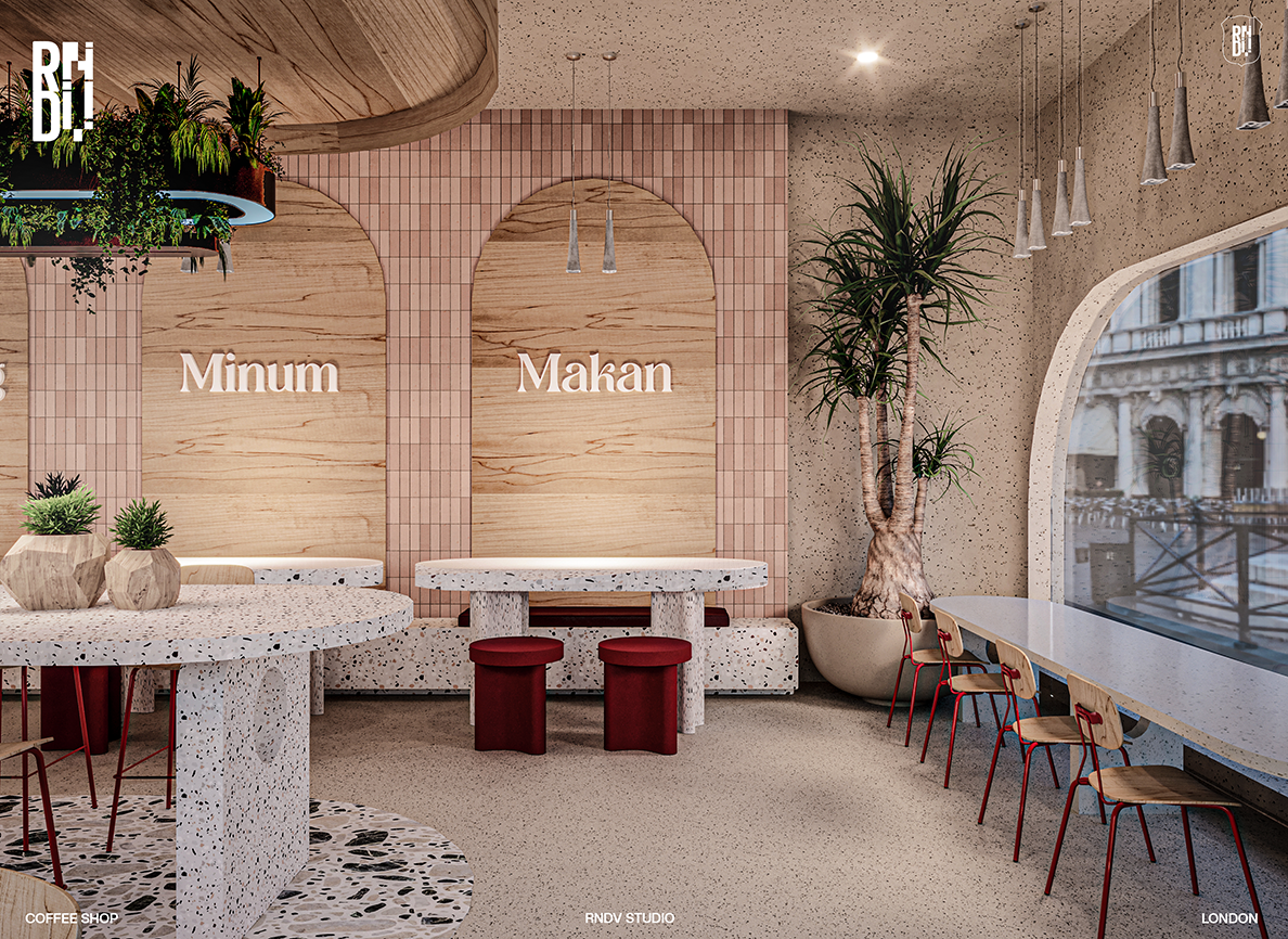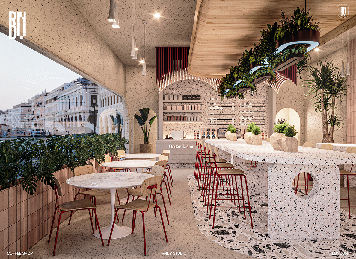 Inspired by a classic style, contrasting shades of coral red, terrazzo finishes and pastel colours create a vibrant identity for this coffee shop in London. The cafe design features a warm and inviting atmosphere with a blend of classic and contemporary elements.